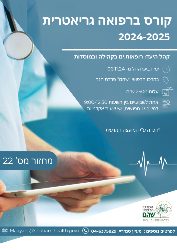 קורס ברפואה גריאטרית 2024-2025  במרכז הרפואי "שהם" | מחזור מס' 22 יפתח ב- 6/11/24 | ההרשמה נפתחה