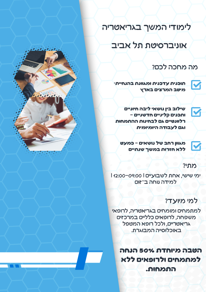 ראשי » חדשות » לימודי המשך בגריאטריה | אוניברסיטת תל-אביב לימודי המשך בגריאטריה | אוניברסיטת תל-אביב תאריך: 28/08/2025 לאתר הקורס השארת תגובה ביטול חייבים להתחבר כדי להגיב.